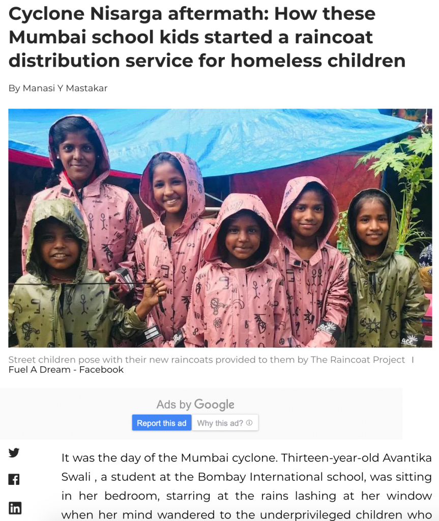 14-year-old Avantika Swali started helping children in Dharavi Schools at a very young age. The looming threat of Cyclone Nisarga amplified this problem. She took it upon herself to design a raincoat prototype that was trendy & wearable with the help of her mother. While producing the raincoats, she ensured that each raincoat would cost just INR 500 – whilst still maintaining its superior quality. In her words, ‘A cool hoodie will ensure that the head is protected and the wearer feels empowered.’ A core team was made and the initiative was called The Raincoat Project to help at least a 1000 children. Ms Priya Aga, (her son Shawn is also doing the campaign), introduced Avantika and her mother to Fueladream.com. Through the campaign, they intended to create ripples but they made waves across Mumbai.